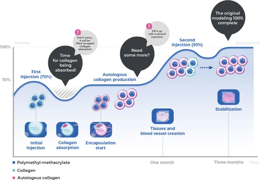 While the collagen in Artecoll provides quick results, the PMMA microspheres ensure that these improvements are long-lasting. PMMA is a biocompatible material that remains in the skin even after the collagen is absorbed. These microspheres act as a scaffold, promoting the body’s natural collagen production. Over time, this new collagen forms around the PMMA particles, helping to maintain the added volume and smoothness for an extended period.